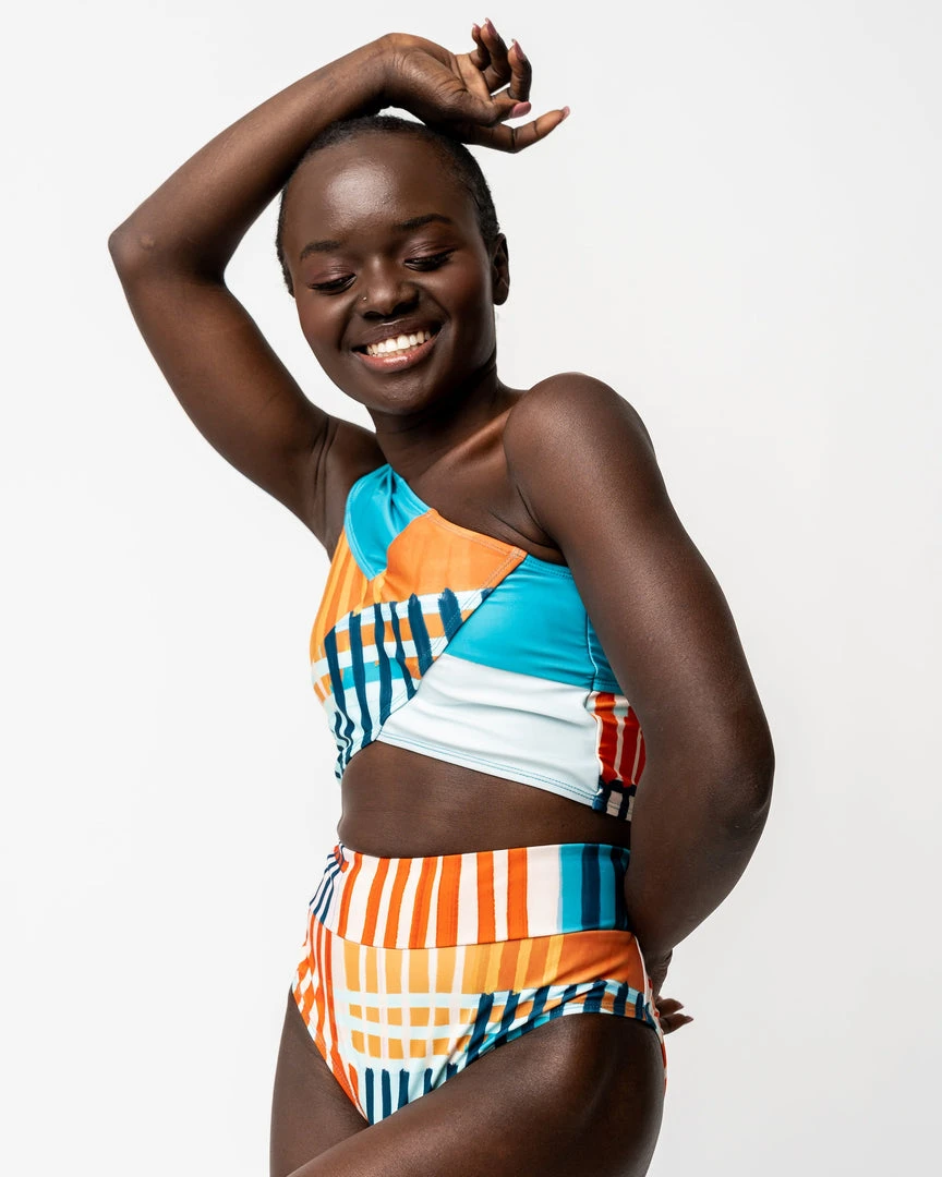 Keeping it simple, this bottom is the perfect everyday option to pair with a busy top. Our all-new 2022 funky striped Ray print includes Coastal navy, bright Rio orange, apricot orange, and a light illusion blue.