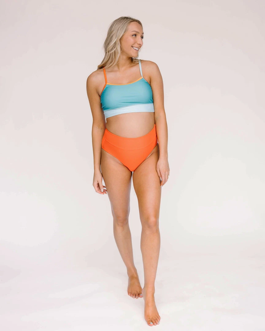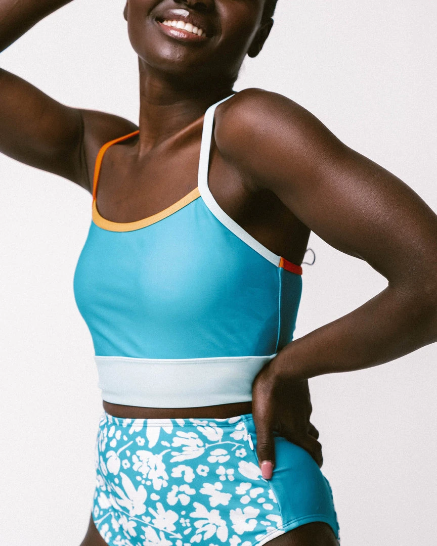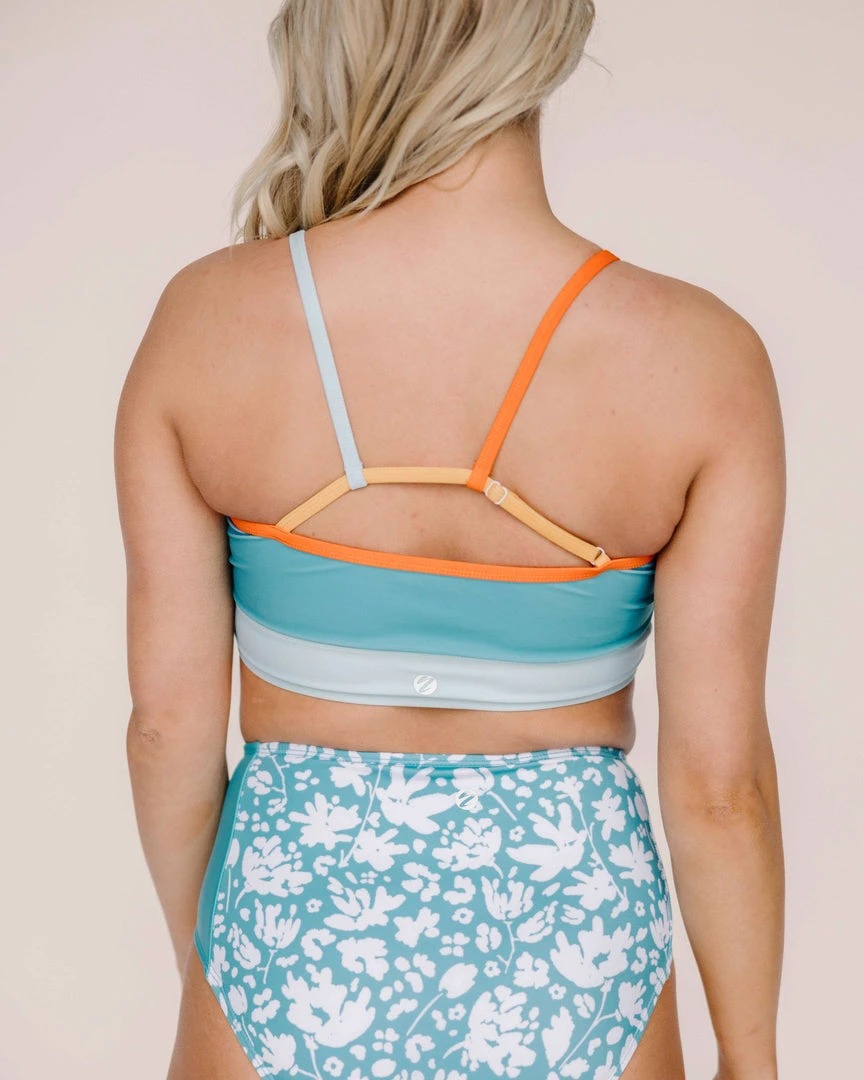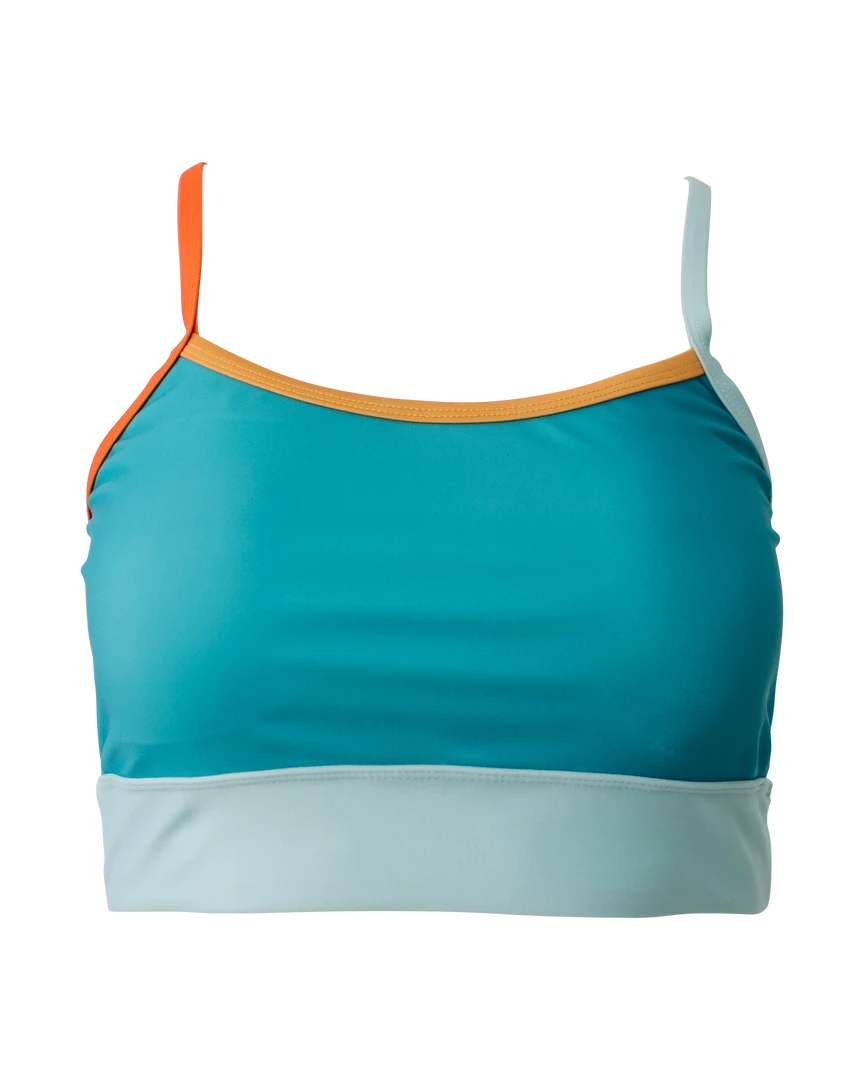Comfortableย AND supportive, theย Shaka Braletteย hasย just the right coverage toย look good and feel good in and out of the water. Bright turquoise with a lightย aqua blue waistband and bright tangerine orange, sunflower yellow, and lightย aquaย blue colored straps making this the perfect mix & match top.