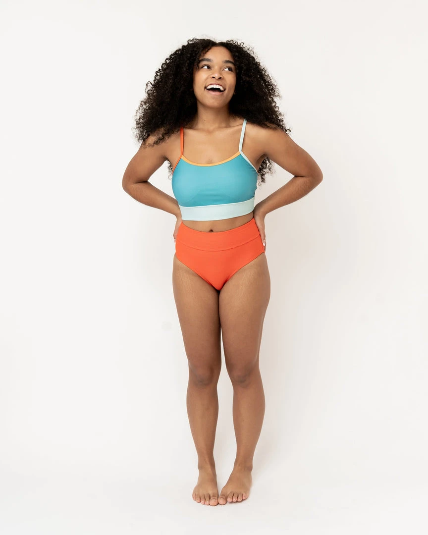 Keeping it simple, this bottom is the perfect everyday option to pair with a busy top.  Our new ribbed fabric adds a modern flair to a classic style. Our brand new bright tangerine color will have you in style all year.