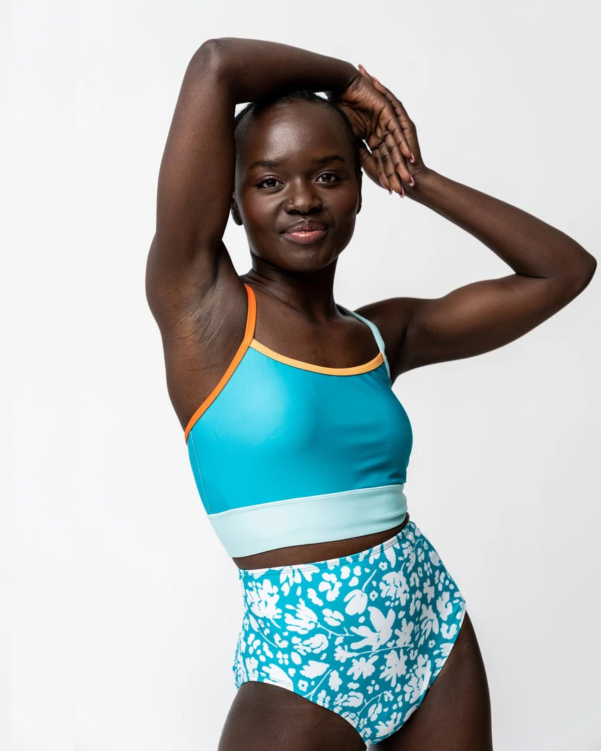 This bottom is a great option for a classic, simple style with a twist featuring a hidden zipper pocket on the solid-colored side panel because every girl needs a swimsuit with a pocket. Bright turquoise and white floral print.